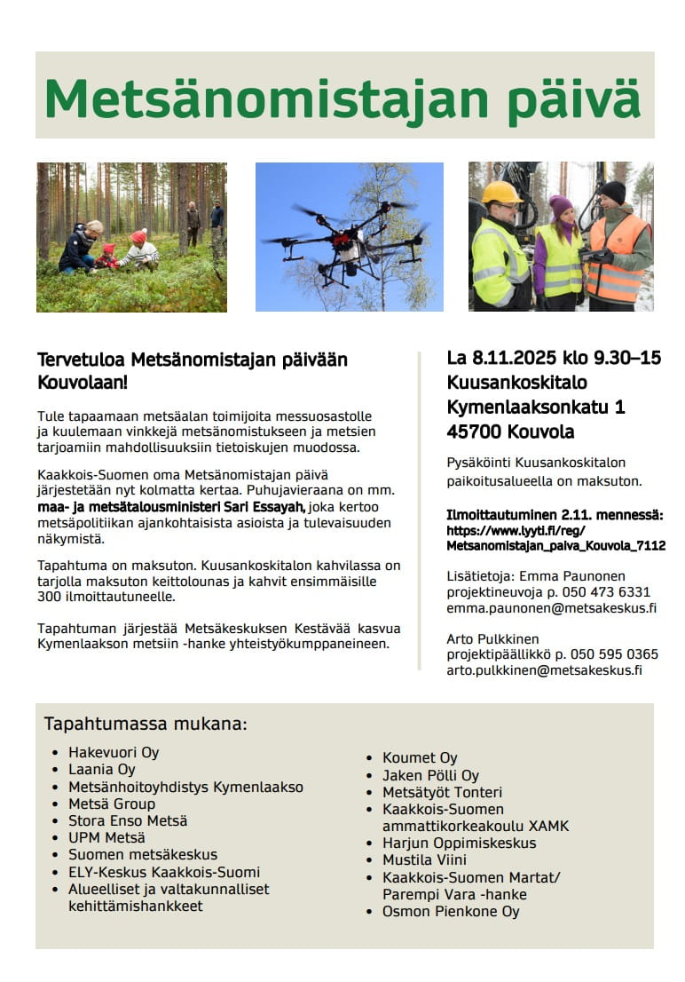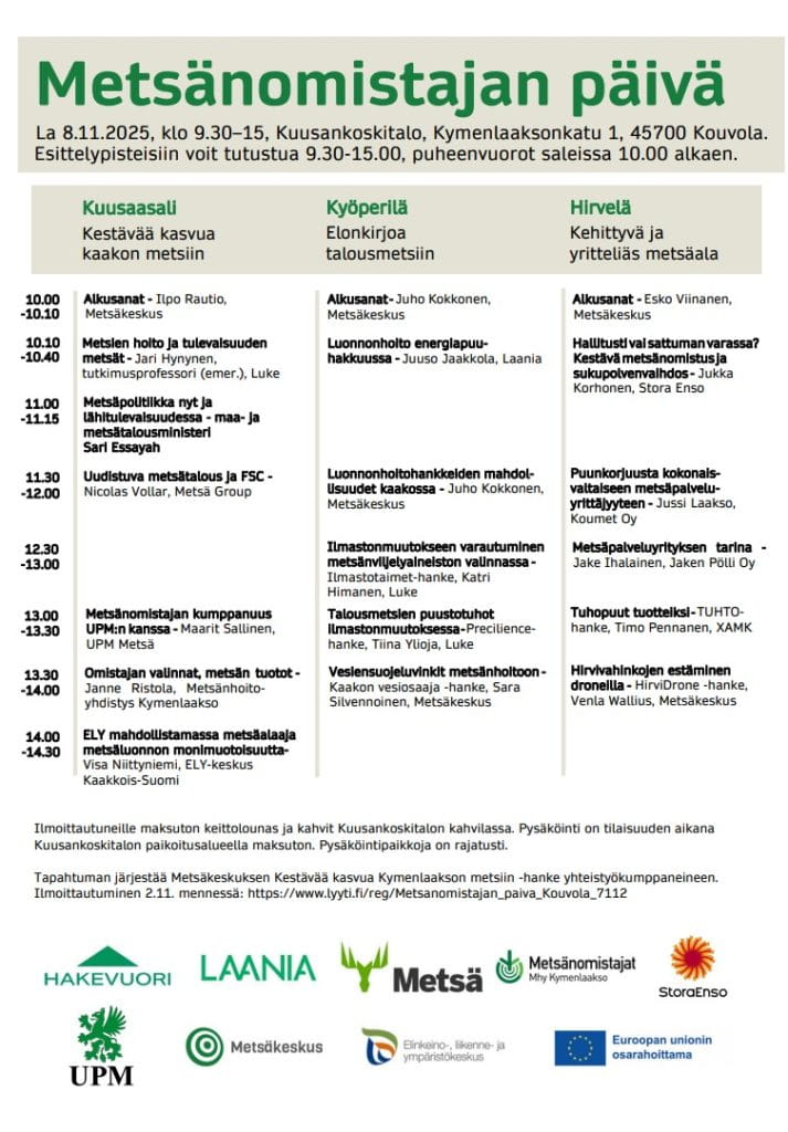 Tapahtuman järjestää Suomen metsäkeskuksen Kestävää kasvua Kymenlaakson metsiin -hanke.